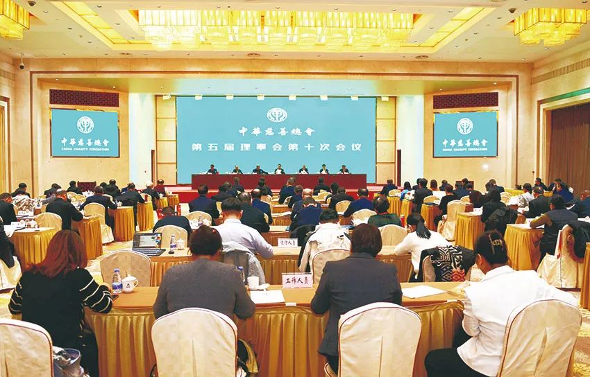 中華慈善總會第五屆理事會第十次會議現場 12月21日,中華慈善總會第五屆理事會第十次會議于北京天泰賓館報告廳召開。中華慈善總會會長宮蒲光,副會長胡可明、孫少華、孫達、劉偉,秘書長邊志偉,會長助理胡傳木及總會第五屆理事會成員出席會議,第五屆監事會監事列席會議。胡可明主持會議。